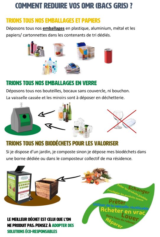 bacs et éviter les passages inutiles. - Réduire l’impact environnemental et les nuisances : Réduire la collecte des OMR permet de diminuer le temps de dépose des bacs dans l’espace public et la circulation, limitant l’encombrement, le bruit et les émissions polluantes associées (émissions atmosphériques, rejets indirects de polluants dans les eaux pluviales liés au roulage des véhicules, etc.). Cela améliore le cadre de vie des habitants tout en favorisant des pratiques respectueuses de l’environnement.